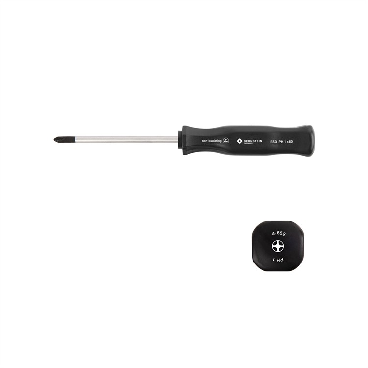 The ergonomic handle of the screwdriver is made of ESD plastic (PP black) and has a surface resistance of 10^5 to 10^7 Ohm. The matt chrome-plated blade is made of high-quality chrome-molybdenum steel (hardness greater than 55 HRC) according to DIN ISO and is hardened over its entire length.