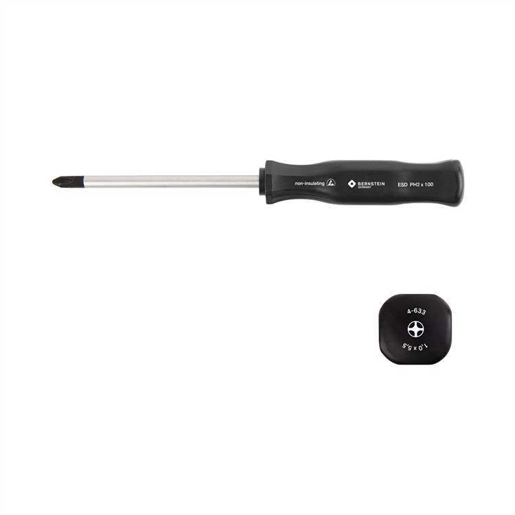 The ergonomic handle of the screwdriver is made of ESD plastic (PP black) and has a surface resistance of 10^5 to 10^7 Ohm. The matt chrome-plated blade is made of high-quality chrome-molybdenum steel (hardness greater than 55 HRC) according to DIN ISO and is hardened over its entire length.